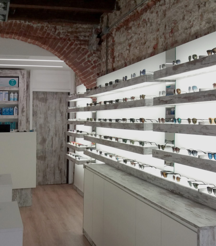 Allo scopo di creare un ambiente unico e originale lo stile Vintage di un punto vendita rivisita il passato con una connotazione attuale. Gli occhiali possono essere esposti su mono mensole o su espositori veri e propri di legno e vetro. La semplicità degli espositori viene però affiancata da elementi dai colori lucidi e brillanti come una parete, un tavolo o un lampadario liberty. Infine, i “pezzi unici” di recupero caratterizzano fortemente lo spazio.